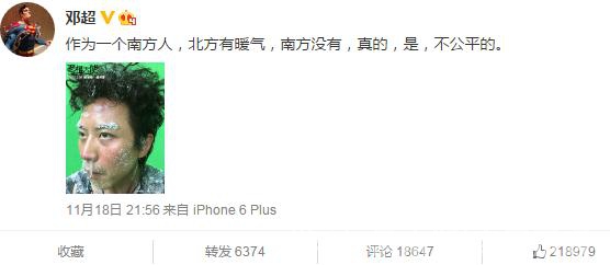 隨著天氣轉(zhuǎn)冷,網(wǎng)友紛紛關(guān)注起暖氣的問題,鄧超也在微博上曬出一張臉被凍僵、鼻涕流出來被凍成冰的照片,并附文稱“作為一個南方人,北方有暖氣,南方?jīng)]有,真的,是,不公平的。”